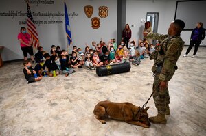 Defenders from the 28th Security Forces Squadron hosted a field trip for the School Age Care program June 25 at Ellsworth Air Force Base. During the trip, the children toured the squadron, explored a police vehicle and viewed a military working dog demonstration. The 28th SFS hosts these tours to