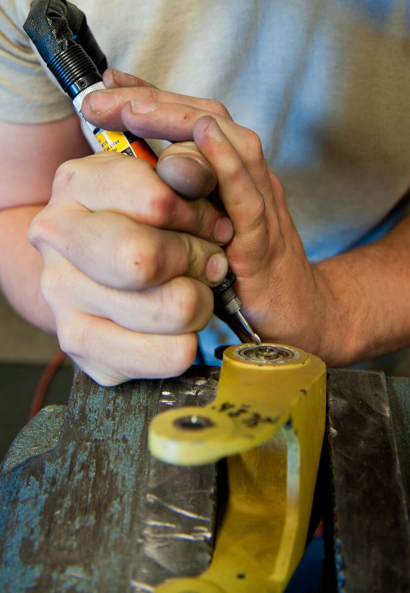 Airman 1st Class Justin Morris, 28th Maintenance Squadron metals technology apprentice, cuts a bushing out of an unserviceable B-1 bomber bell crank housing and replaces it in the metals technology shop at Ellsworth Air Force Base, S.D., May 2, 2012. The replacement part started as a block of metal approximately 2 inches wide, 6 inches long and 4 inches in depth, which was subsequently crafted into a new serviceable bell crank housing for a B-1 bomber. (U.S. Air Force photo by Airman 1st Class Kate Thornton/Released)