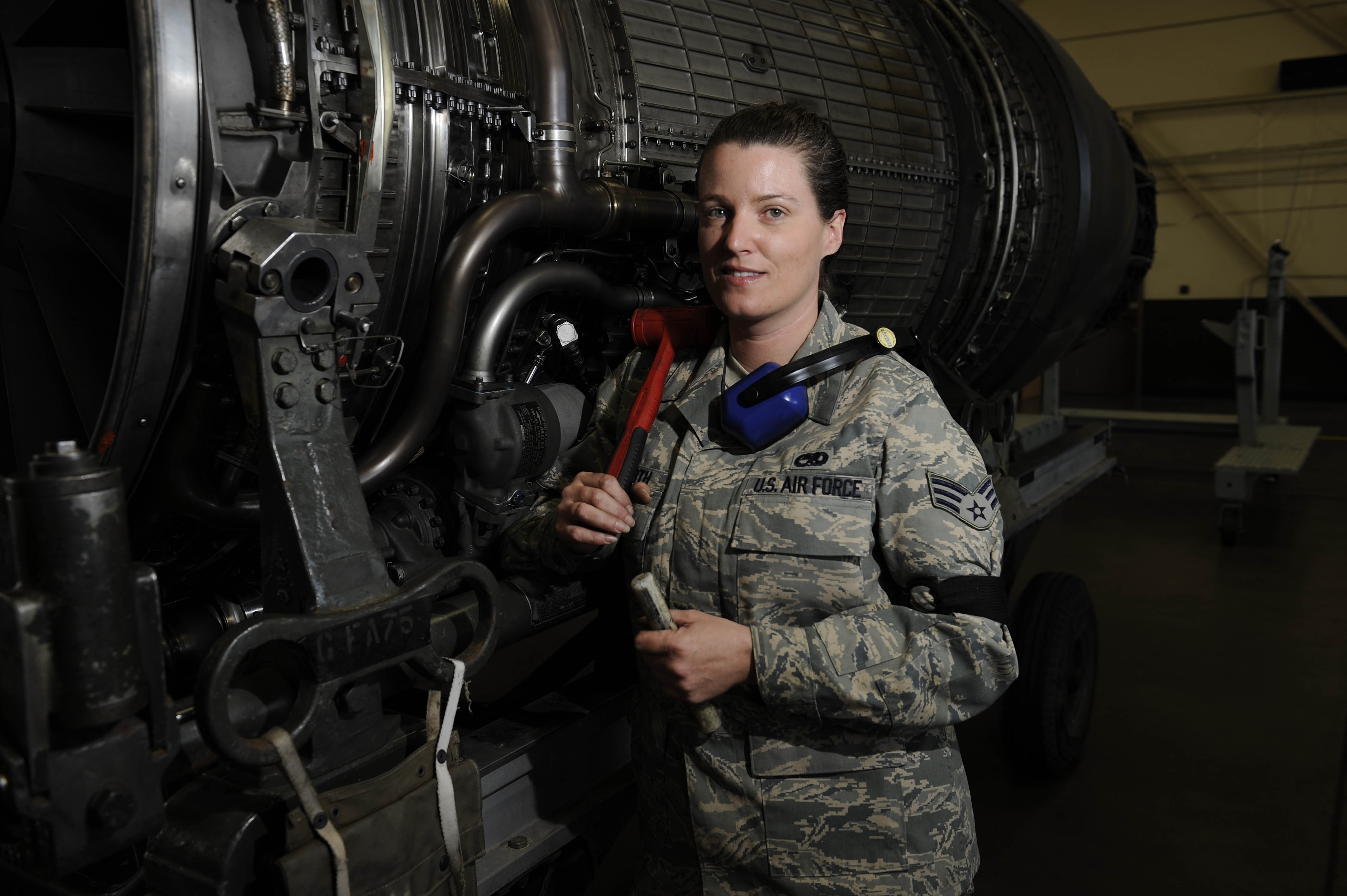 Senior Airman Angelique Hasz, 28th Maintenance Squadron aerospace propulsion journeyman, connects safety wire to fuel, brake and oil lines underneath a B-1B Lancer's General Electric F101 turbofan engine here, March 17. Airman Hasz is one of three women working in the propulsion backshop. Since 1987, the month of March has been recognized as Women's History Month and highlights women of the past and future. (U.S. Air Force photo by Airman 1st Class Corey Hook)