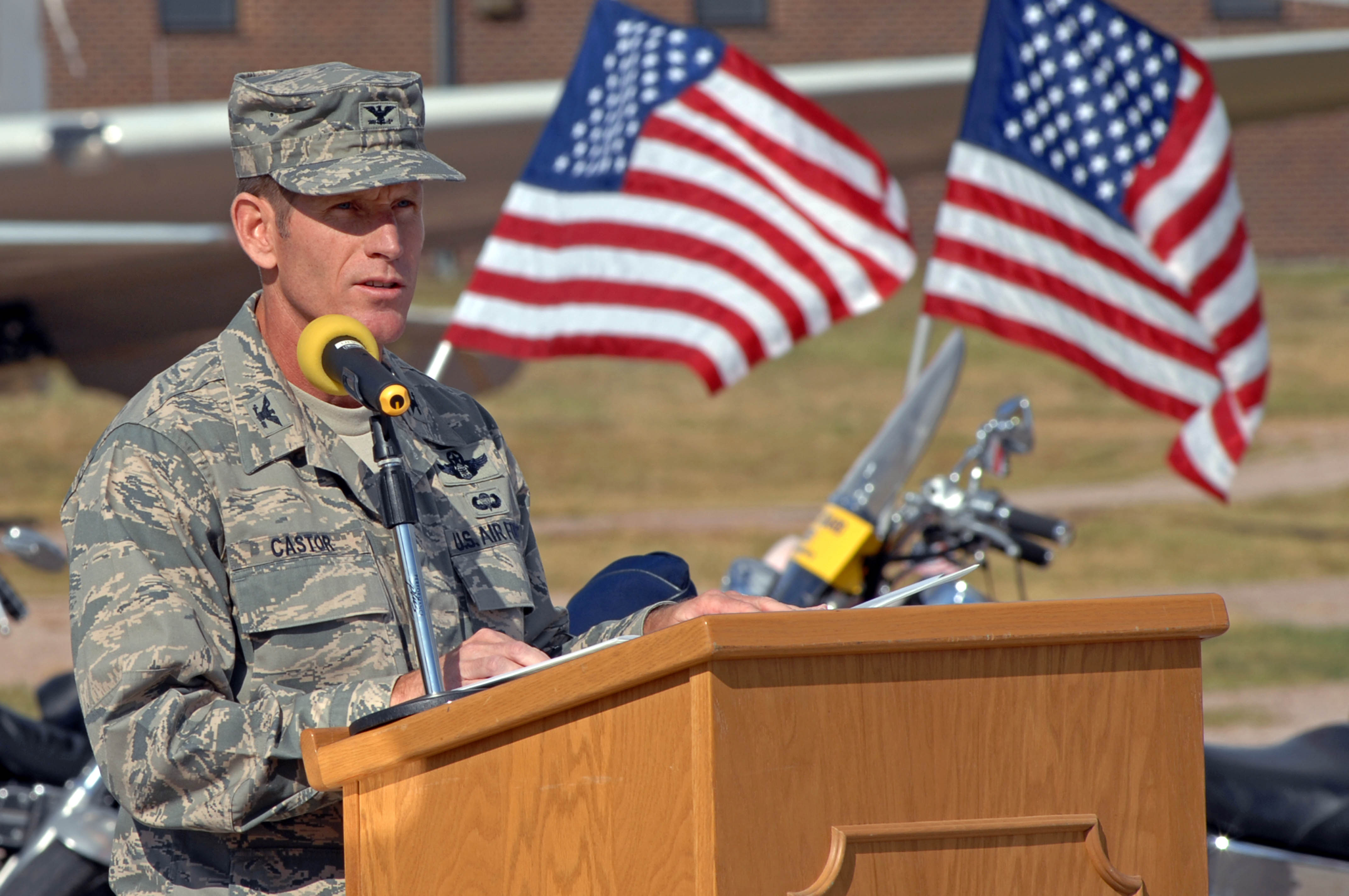 Ed Woidt, Patriot Guard Rider, looks at the B1-B Lancer static display during his attendance at the 9/11 memorial at the South Dakota Air and Space Museum Sept. 11. The Patriot Guard Riders stand the flag line to honor America's fallen heroes, veterans and present members who continue to serve. (U.S. Air Force photo by Airman Corey Hook)