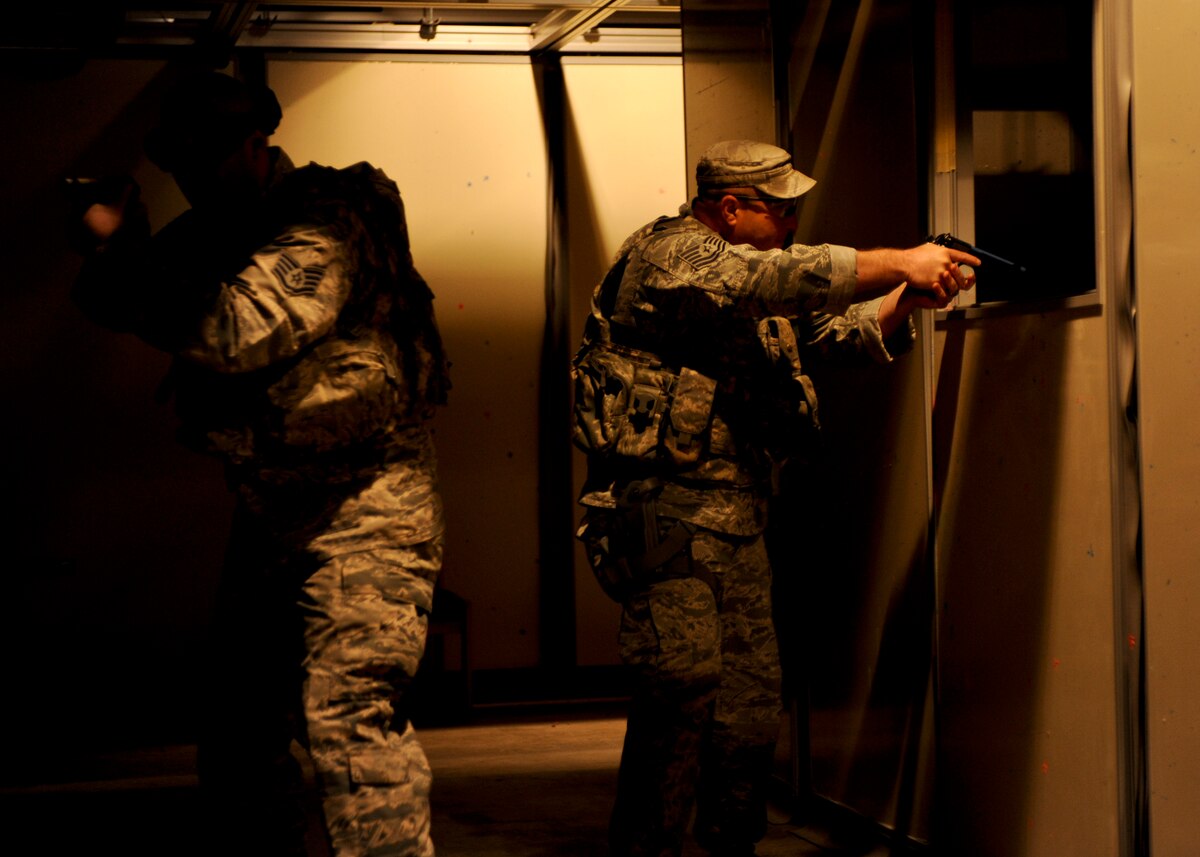 Tyrone Lee, Sturgis Police Department patrol officer, prepares to move during a shoot-house competition at Ellsworth Air Force Base, S.D., May 12, 2015. As part of Police Week, the competition promoted camaraderie between military and local law enforcement agencies, and was one of a variety of events to include a retreat ceremony, weapons and vehicles display and a softball tournament, all of which took place May 11 - 16. (U.S. Air Force photo by Senior Airman Anania Tekurio/Released)