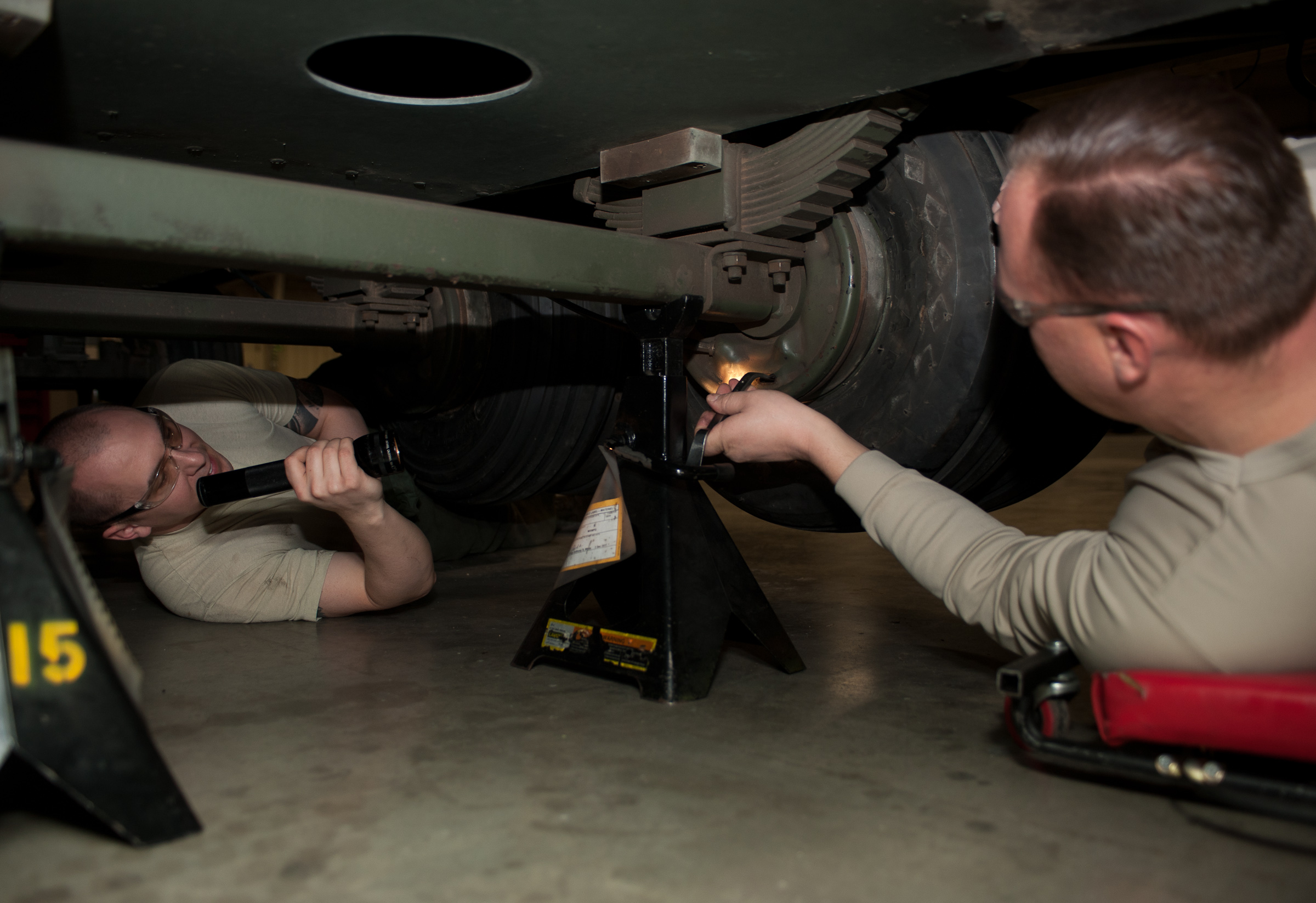 Tech. Sgt Robert Holyoke (left), 28th Munitions Squadron support equipment technician, and Tech. Sgt Christopher Shields, 28th Munitions Squadron trailer maintenance NCO in charge, adjust brake pads on a munitions trailer during a brake bleeding process at Ellsworth Air Force Base, S.D., Feb. 7, 2013. The 28th MUNS is responsible for the maintenance and upkeep of more than 175 munitions trailers on base. (U.S. Air Force photo by Airman 1st Class Alystria Maurer/Released)