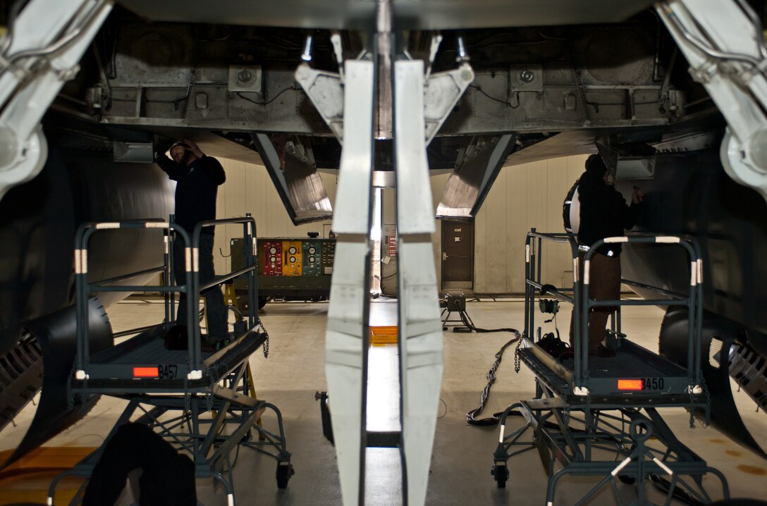 Brandon Simmons (left), 28th Aircraft Maintenance Squadron contract field team aircraft mechanic, and Derrick Brown, 28th AMXS contract field team engine mechanic, work on B-1 fuel cooling scoops during a home station maintenance check at Ellsworth Air Force Base, S.D., Jan. 22, 2013. After the fuel cooling scoops are removed, the bushings at the hinge points are replaced due to excessive wear since the last inspection. (U.S. Air Force photo by Airman 1st Class Alystria Maurer/Released)