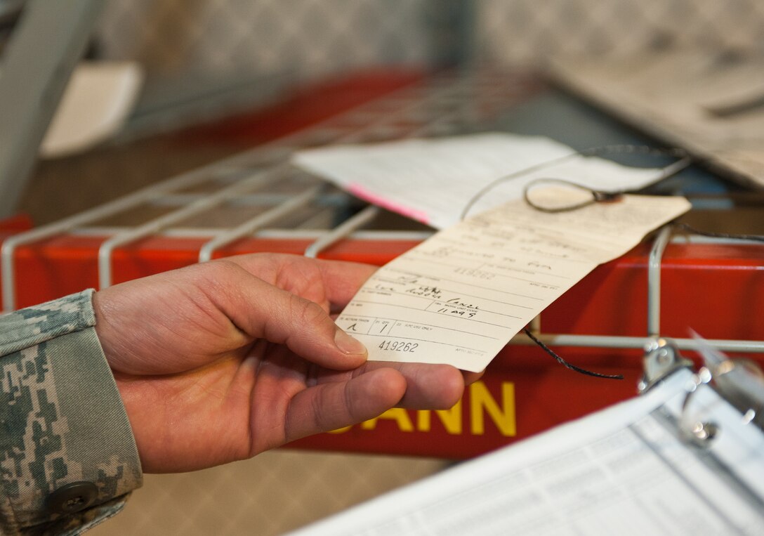 Senior Airman Irvin Vazquez-Casanova, 28th Aircraft Maintenance Squadron combat oriented supply organization technician, checks a part tag to ensure accountability at Ellsworth Air Force Base, S.D., Oct. 25, 2012. The hundreds of items stored in the 28th AMXS COSO shop must be labeled properly to be easily tracked and found. (U.S. Air Force photo by Airman 1st Class Alystria Maurer/Released)
