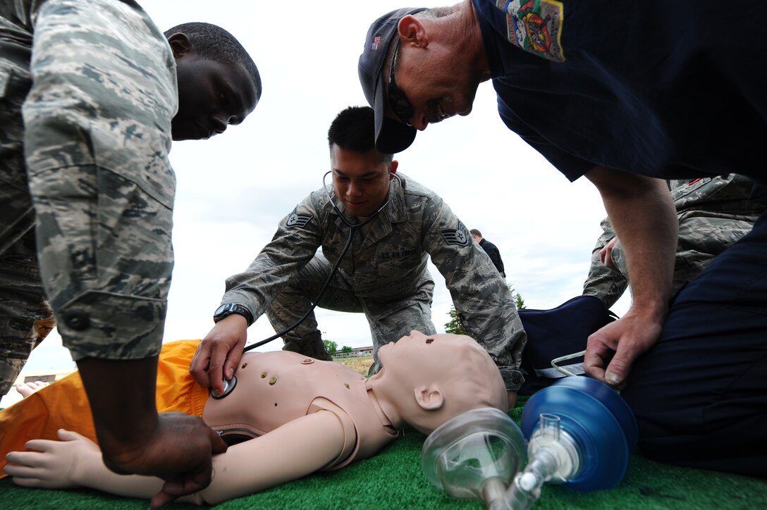 Staff Sgt. Clayton Lurker, 28th Medical Group medical technician, checks for vital signs on a simulated patient with the assistance of Airman 1st Class Irving Adams, 28th Civil Engineer Squadron fire protection apprentice, and Bill Cina, 28th CES civilian contractor, during joint trauma medical training at Ellsworth Air Force Base, S.D., May 23, 2012. Ellsworth Airmen received both lectures and hands-on learning scenarios provided by Simulation in Motion-South Dakota, a program dedicated to implementing statewide outreach education for hospital personnel and first responders. (U.S. Air Force photo by Airman 1st Class Zachary Hada/Released)