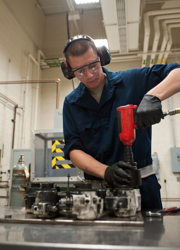 Airman 1st Class Conner Tolley, 28th Maintenance Squadron hydraulics technician, loosens brake housing pistons during disassembly at Ellsworth Air Force Base, S.D., May 11, 2012. When any problems occur with B-1 brake systems, they are disassembled, inspected, fixed, reassembled and extensively tested before being reinstalled. (U.S. Air Force photo by Airman 1st Class Alystria Maurer/Released)