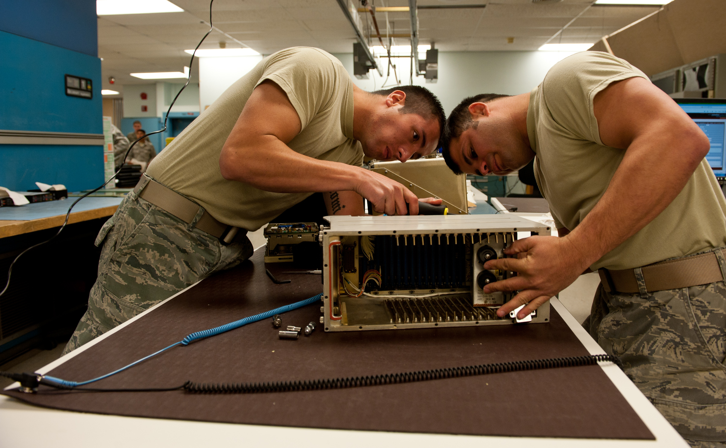 Senior Airmen Steven Rosales (left) and David Fisher, 28th Maintenance Squadron avionics technicians, remove a motherboard from a central integrated test system data acquisition unit to replace guide pin sleeves at the digital analog video avionics shop on Ellsworth Air Force Base, S.D., May 9, 2012. The unit allows the B-1 bomber avionics systems to operate correctly and is secured within the B-1 by guide pin sleeves. (U.S. Air Force photo by Airman 1st Class Kate Thornton/Released)