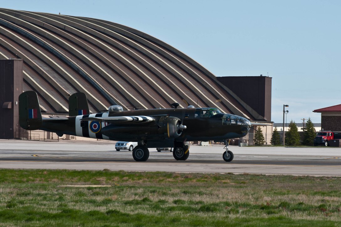 A B-25D Mitchell Bomber from the Historic Flight Foundation named “Grumpy” taxis down the flightline to prepare for take off at Ellsworth Air Force Base, S.D., April 20, 2012. The visit to Ellsworth was a part of its return journey to Snohomish County Airport north of Seattle, Wash., from the final Doolittle Raider reunion event held at the National Museum of the U.S. Air Force in Ohio. “Grumpy” is one of the oldest flying B-25s in the world, and most closely resembles the variant of the 16 bombers flown by Lt. Col. James Doolittle and his crews. (U.S. Air force photo by Airman 1st class Zachary Hada/Released)