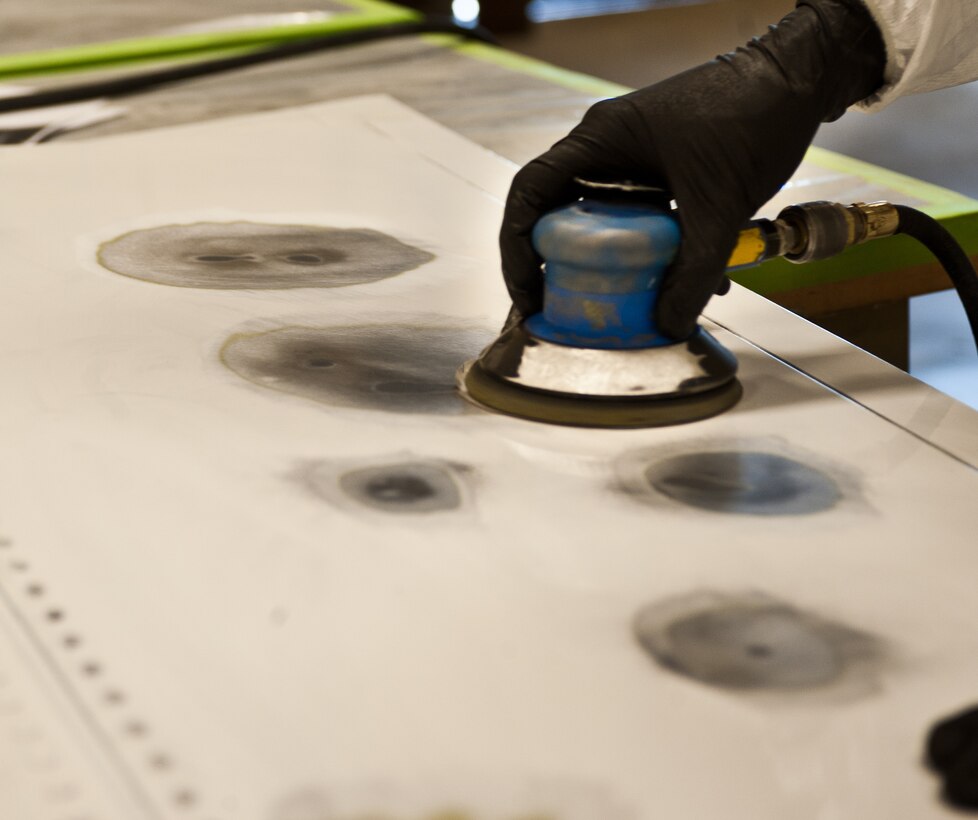 Senior Airman Spencer Hensinger, 28th Maintenance Squadron aircraft structural maintenance technician, uses an orbital sander to remove defects at Ellsworth Air Force Base, S.D., April 3, 2012. Filler is applied to dents then sanded down to maintain the integrity and smoothness of the part intact and free of flaws. (U.S. Air Force photo by Airman 1st Class Alystria Maurer/Released)