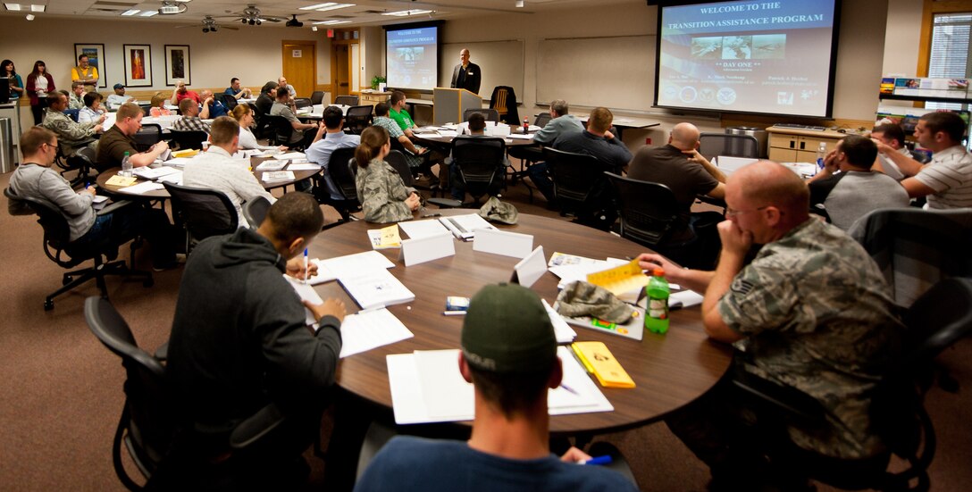 Airmen participate in a Transition Assistance Program class in the Airmen and Family Readiness Center on Ellsworth Air Force Base, S.D., March 26, 2012. The program is designed to ease the transition from military to civilian life when Airmen and their families are planning to separate or retire from the Air Force. (U.S. Air Force photo by Airman 1st Class Kate Thornton/Released)
