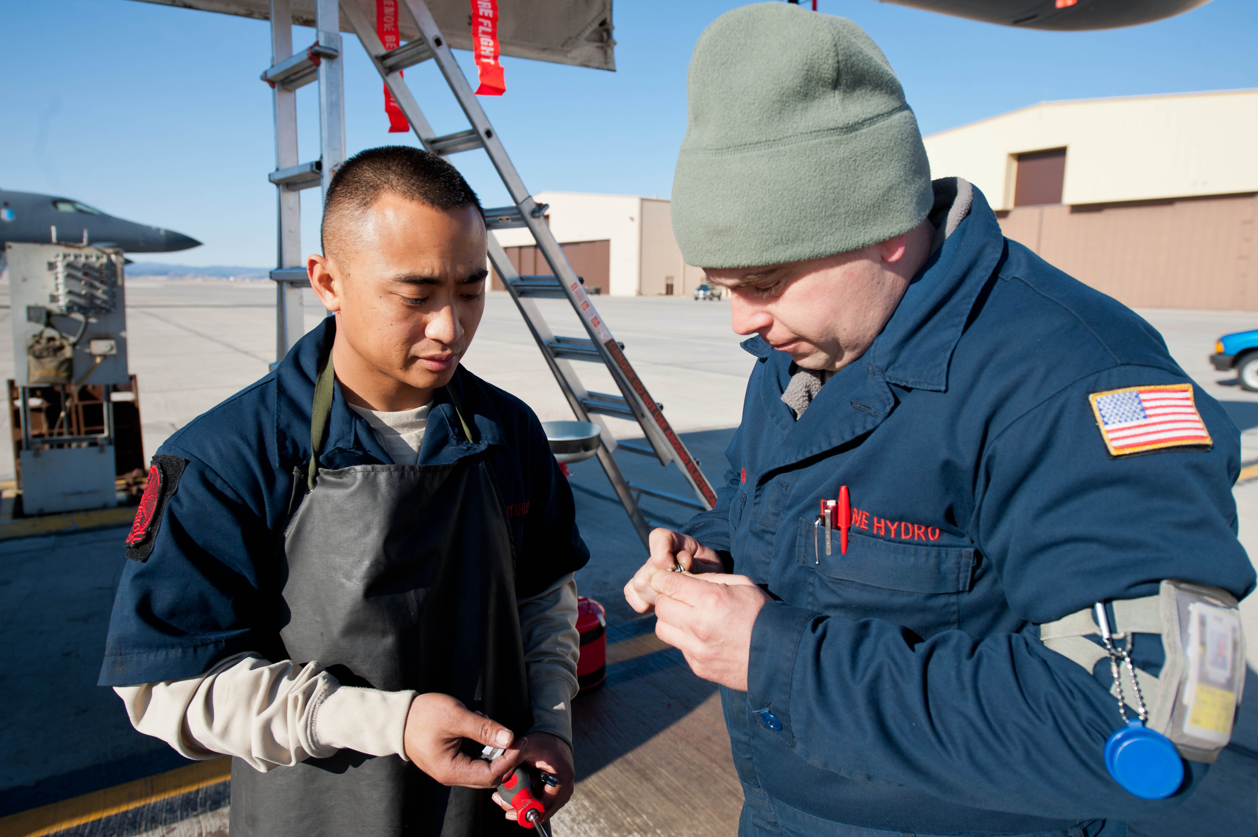 Staff Sgt. John Bellardino (right), and Senior Airman David Ching, 28th Aircraft Maintenance Squadron aircraft systems specialists, inspect parts removed from a B-1B at Ellsworth Air Force Base, S.D., March 8, 2012. Aircraft systems specialists diagnose fuel system and component malfunctions, recommend corrective actions, and resolve functional problems. (U.S. Air Force photo by Airman 1st Class Zachary Hada/Released)
