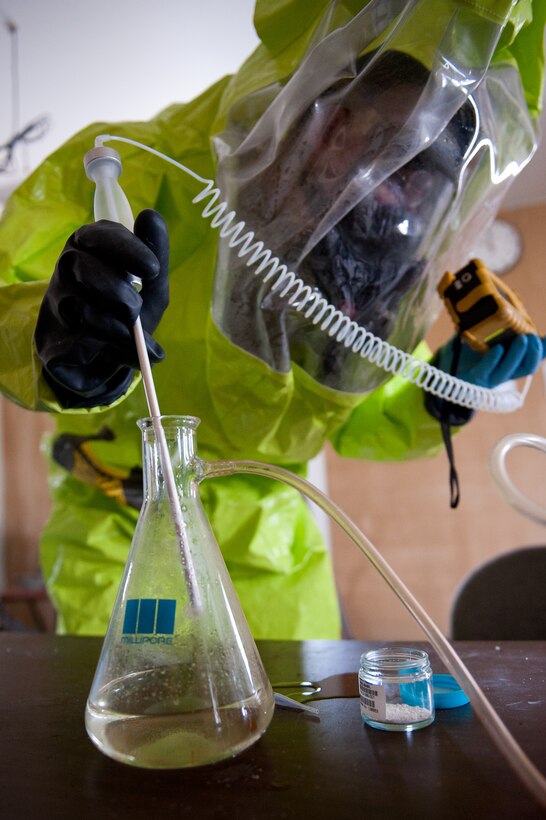 Airman 1st Class Jeremy Harrison, 28th Civil Engineer Squadron emergency management journeyman, uses a multi-ray gas detector to test unknown substances for potentially hazardous properties during a training exercise at Ellsworth Air Force Base, S.D., Jan. 20, 2012. Emergency management trains for real-world scenarios by using an array of instruments to test and monitor a wide variety of hazardous material. (U.S. Air Force photo by Airman 1st Class Kate Thornton/Released)