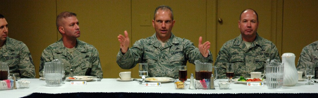 Chief Master Sgt. Martin Klukas, Air Combat Command command chief, speaks with senior non-commissioned officers during a luncheon at the Dakota’s Club on Ellsworth Air Force Base, S.D., April 15, 2011. “You have to know how to motivate your warriors,” Chief Klukas said. “The diversity we have is a great asset to the fight.” (U.S. Air Force photo by Senior Airman Jarad A. Denton)
