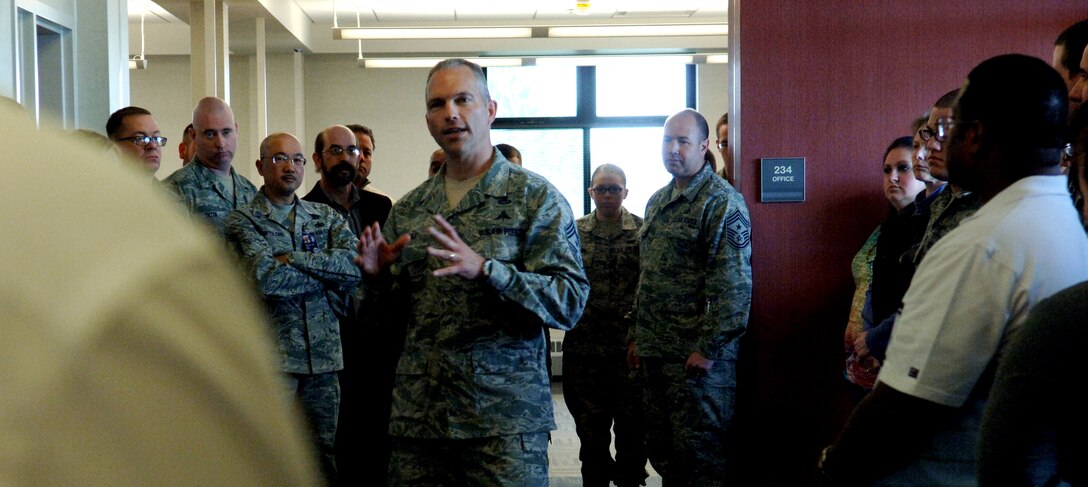 Chief Master Sgt. Martin Klukas, Air Combat Command command chief, speaks with Airmen at the Air Force Financial Services Center at Ellsworth Air Force Base, S.D., April 15, 2011. During his visit, Chief Klukas listened to questions and concerns from Airmen across the base. (U.S. Air Force photo by Senior Airman Jarad A. Denton)