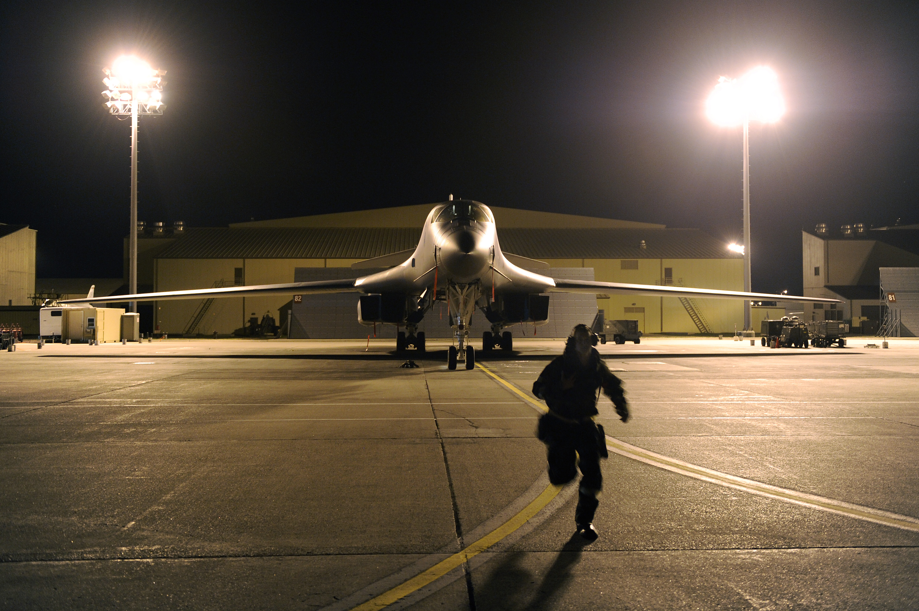 ELLSWORTH AIR FORCE BASE, S.D. – An Airman assigned to the 28th Aircraft Maintenance Squadron runs across the flight line during a Phase II Operational Readiness Inspection, Oct. 14. The 28th AMXS manages the on-equipment maintenance, weapons loading and support activities of the B-1B Lancer fleet to meet the 28th Bomb Wing’s flying requirements. (U.S. Air Force photo/Staff Sgt. Marc I. Lane)