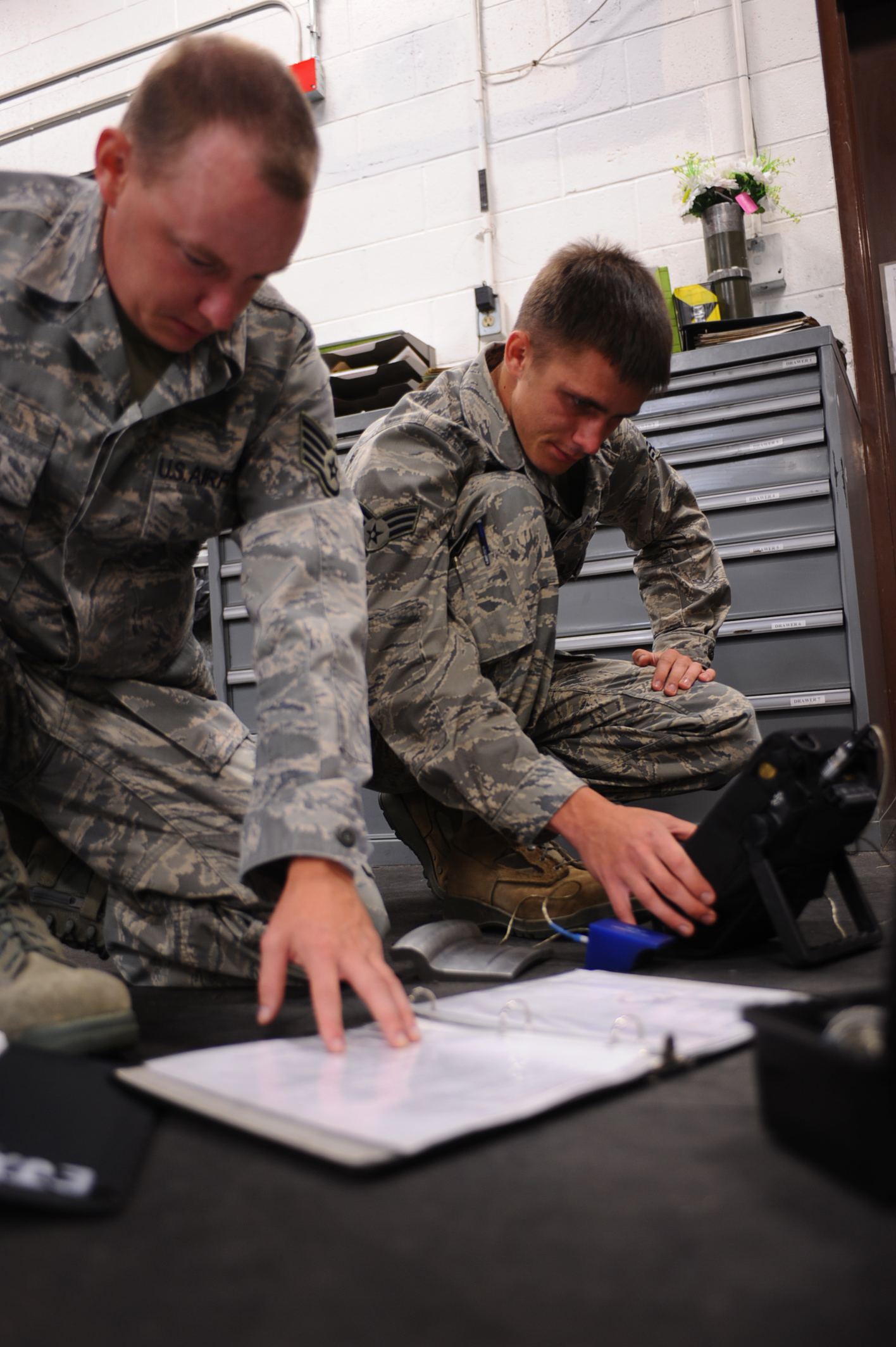 ELLSWORTH AIR FORCE BASE, S.D. - Staff Sgt. Brandon Roel (left), 28th Maintenance Squadron non-destructive inspection technician, reads off the specification as Senior Airman Evan Bryant (right), 28 MXS NDI technician, inputs it into Eddy Current Equipment as part of the calibration setup Sept. 2. The equipment is calibrated before conducting a routine inspection on B-1B Lancer landing gear wheels. (U.S. Air Force photo/Senior Airman Kasey Close)