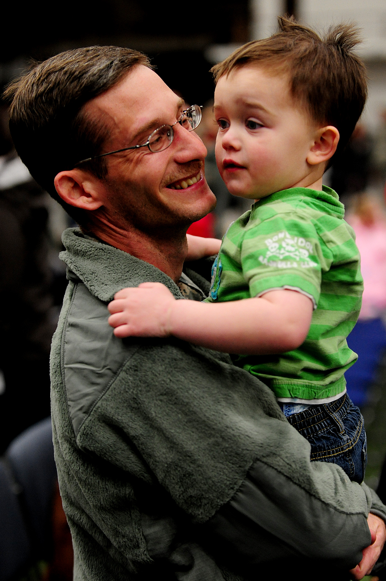 ELLSWORTH AIR FORCE BASE, S.D. -- An Ellsworth Airman holds his son after returning from deployment to Southwest Asia, Jan. 29. Approximately 300 Airmen serving in various roles deployed to support Operations Iraqi and Enduring Freedom. (U.S. Air Force photo/Airman 1st Class Joshua J. Seybert)