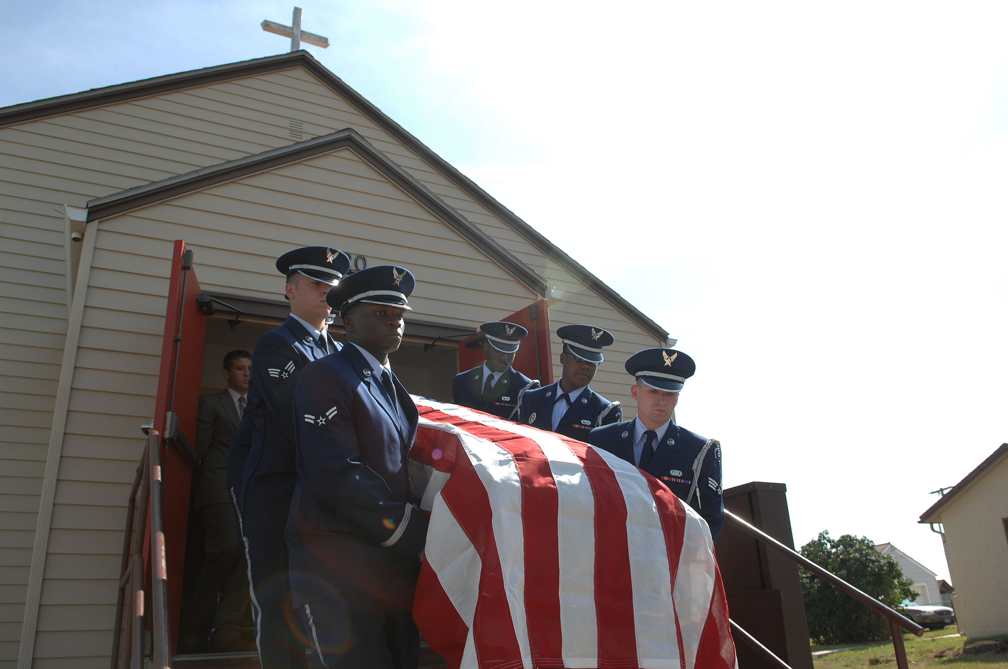Airmen from Ellsworth Air Force Base Honor Guard carry a coffin out of St. Matthew's Episcopal Church in Rapid City, S.D., Sept. 15. The primary mission of the U.S. Air Force Base Honor Guard program is to employ, equip and train Air Force members to provide professional military funeral honors for active duty, retired members and veterans of the United States Air Force. (U.S. Air Force photo by Airman 1st Class Corey Hook)