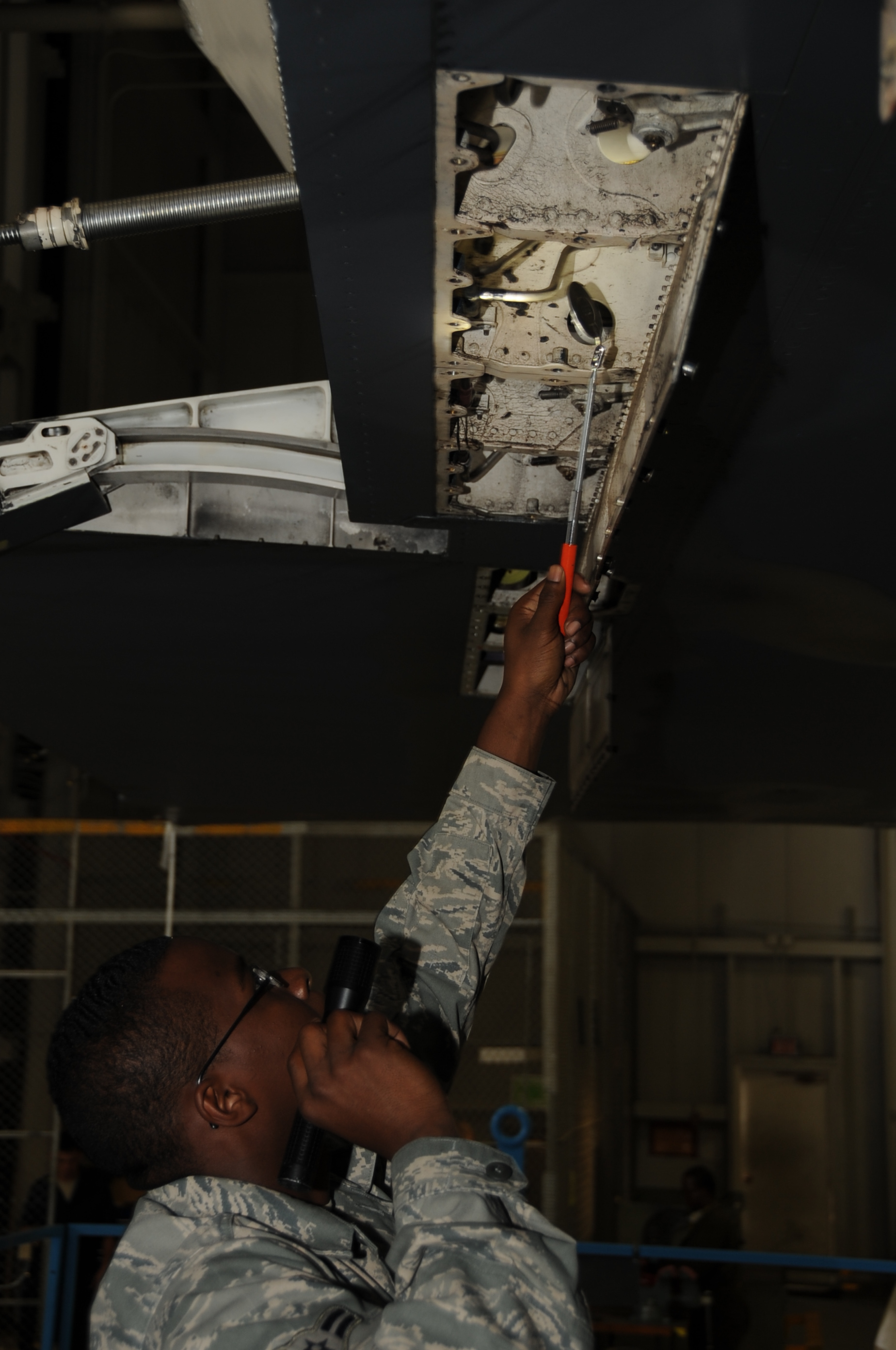 Airman 1st Class Lloyd Brown, 28th Maintenance Squadron crew chief, inspects the B-1B Lancer's swing down to ensure all lines are connected properly here, August 19. Airman Brown uses an extendable mirror to check hard-to-see areas. (U.S. Air Force photo/Airman 1st Class Anthony Sanchelli)
