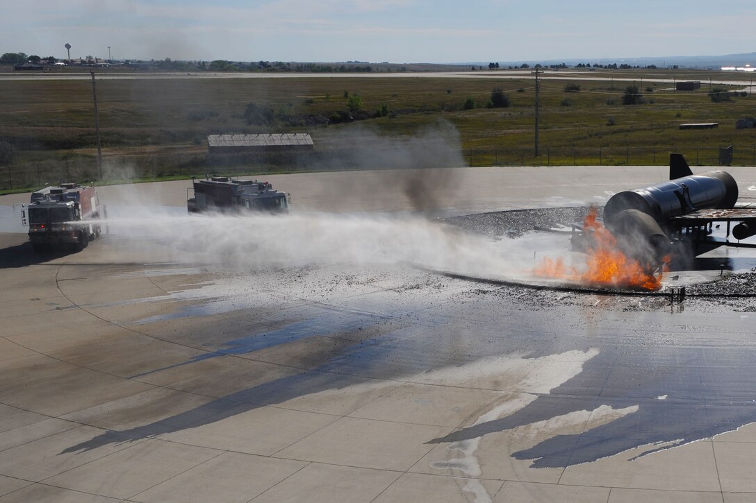 Aircraft rescue firefighting vehicles extinguish a simulated aircraft fire during a pit burn training exercise at Ellsworth Air Force Base, S.D., Sept. 18, 2013. ARF vehicles can hold up to3,300 gallons of water and the torrets are capable of releasing 250 gallons a minute. (U.S. Air Force photo by Airman 1st Class Rebecca Imwalle / Released)