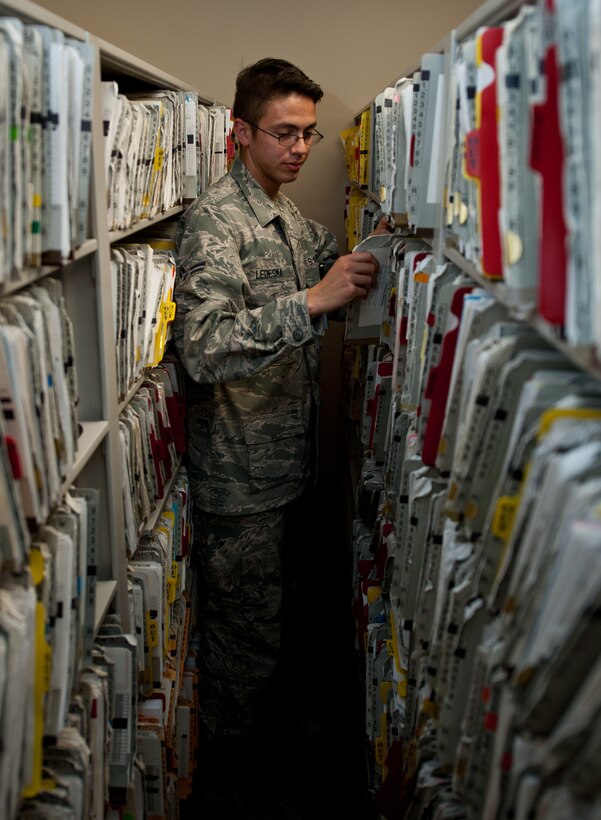 Airman 1st Class Kenneth Ledesma, 28th Medical Support Squadron medical records technician, files medical records at Ellsworth Air Force Base, S.D., Sept. 6, 2013. Outpatient records technicians ensure more than 40,000 medical files are up to date at all times. (U.S. Air Force photo by Airman 1st Class Alystria Maurer/Released)