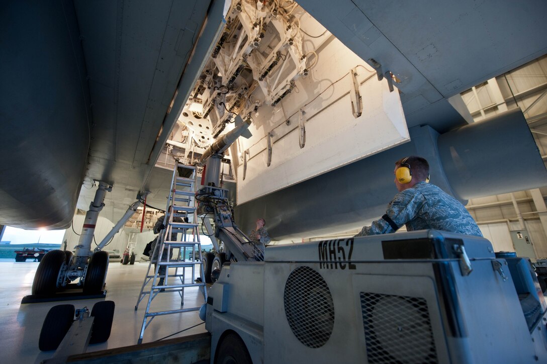 Load crew team members assigned to the 28th Aircraft Maintenance Squadron load an inert guided bomb unit into a mock B-1 bomber simulator in the Load Crew Training Facility at Ellsworth Air Force Base, S.D., Aug. 13, 2013. After every tasking, weapons loaders perform quality checks to verify all weapons systems are operational prior to B-1 missions. (U.S. Air Force photo by Airman 1st Class Zachary Hada/Released)