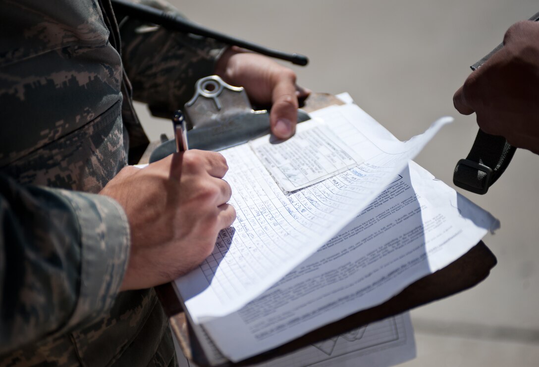 Airman 1st Class Steven Hernandez, 28th Operations Support Squadron Airfield Management operations coordinator, performs a spot check for proper documentation to ensure Airman 1st Class Jeffery Reinke, 28th Security Forces Squadron patrolman, has the correct credentials required to drive on the flightline at Ellsworth Air Force Base, S.D., July 19, 2013. Spot checks like this allow airfield management Airmen to verify personnel are qualified to drive on the flightline. (U.S. Air Force photo by Airman 1st Class Alystria Maurer/Released)