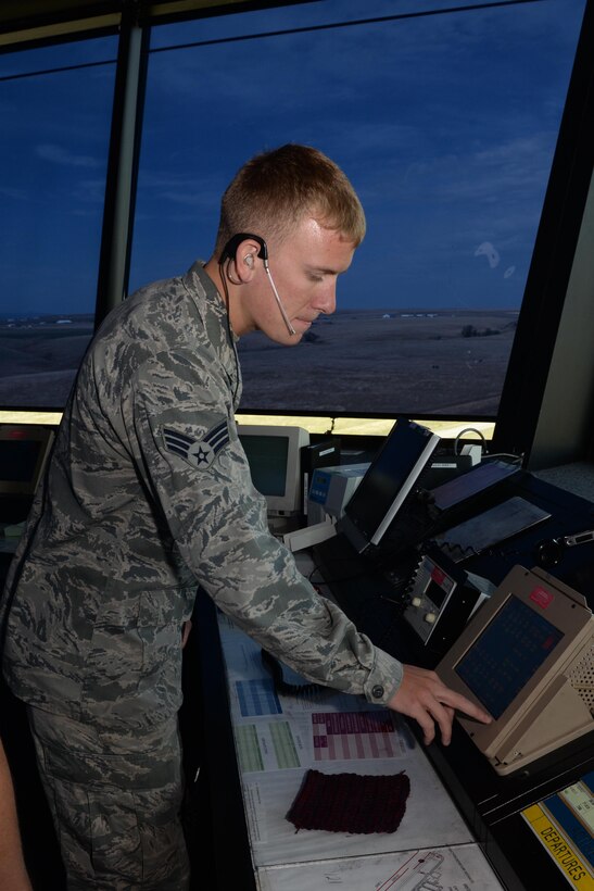 Senior Airman Andrew Ahrendt, 28th Operations Support Squadron air traffic controller, makes contact with ground crews at Ellsworth Air Force Base, S.D., Sept. 22, 2014. Controllers work with many base agencies including ground crews, weather, the fire department and airfield management to ensure that they are fully aware of all possible flight complications and are able to relay important information to the aircrew. (U.S. Air Force photo by Airman 1st Class Rebecca Imwalle/ Released)