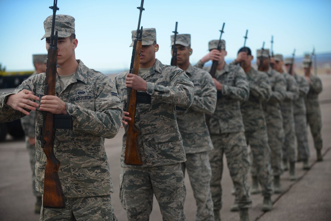 Ellsworth Honor Guardsmen practice live-firing party movements at Ellsworth Air Force Base, S.D., Feb. 9, 2015. The base Honor Guard pays tribute to those who have served by performing a variety of military honors for active-duty servicemembers, veterans and U.S. military retirees. (U.S. Air Force photo by Senior Airman Zachary Hada/Released)