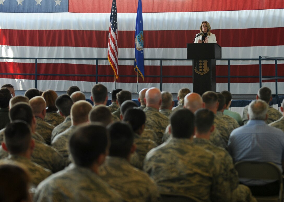 Secretary of the Air Force Deborah Lee James provides an update on Air Force issues during an all-call at Ellsworth Air Force Base, S.D., July 20, 2015. James shared current Air Force policy changes as well as outlining her priorities as Secretary of the Air Force and concluded with a question and answer session. (U.S. Air Force photo by Senior Airman Anania Tekurio/Released)