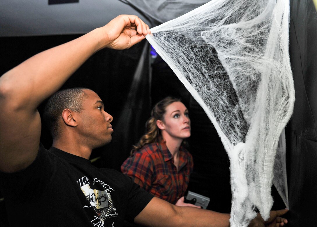 Airman 1st Class Gregory Smith, an avionics technician, and Senior Airman Amber Burns, a non-destructive inspection expert, both assigned to the 28th Maintenance Squadron, hang up decorations for Haunted Camp Lancer on Oct. 27, 2016. Haunted Camp Lancer will be available to all military, dependents and DOD civilians Oct. 28 and 29 from 6-9 p.m. The event is free for all guests, but canned goods or winter clothing donations are encouraged and will be given to the local community. (U.S. Air Force photo by Airman 1st Class Randahl J. Jenson)