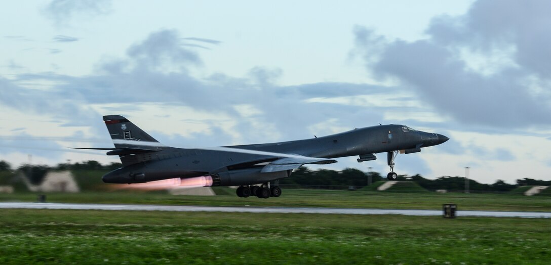 A U.S. Air Force B-1B Lancer takes off from Andersen AFB, Guam Oct. 25, 2016 to conduct integration training with Royal Australian Air Force joint terminal air controllers. While the two air forces share roots dating back to their respective formations, this is the first time in at least 10 years that B-1s have conducted close air support training in the vicinity of Australia. The B-1B is assigned to the 34th Expeditionary Bomb Squadron, deployed to Guam from Ellsworth AFB, S.D. as part of Pacific Air Force’s continuous bomber presence. (U.S. Air Force photo by Senior Airman Arielle Vasquez/Released)