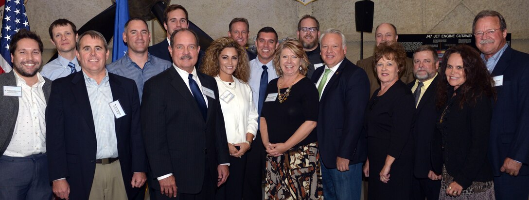Sixteen civic and business leaders were inducted into the 28th Bomb Wing Honorary Commanders program during a special event Nov. 10 at the South Dakota Air & Space Museum. Pictured are: Daniel Leal-Fernandez, Kol operating partner; Dr. Rob Schleiffarth, West River Ear, Nose and Throat Clinic physician; Don Policky, Big D Oil Company CEO; Nick Wald, RPM Innovations general manager; Dr. Jeff Burns, Parkside Chiropractic owner; Linden Evans, Black Hills Corporation president; Michelle and Drake Peterson, Slate Creek Grille owner; Adam Templeton, Farmer's Insurance Company agent; Sandra Schwan, Great Western Investment Company advisor; Chaplain David Kinnan, Fountain Springs Church lead pastor; Corey Brubakken, Pennington County Sheriff's Office captain; Julie and Brent Albrecht, Brink Constructors, Inc., vice president; Dr. Kelly Manning, Rapid City Emergency Services surgeon; and Mary and Jim Scull, Scull Construction CEO. Also selected but not pictured are Justin Christman, The Man Salon owner, and Katie Magbuhat, Cabela's marketing manager. (U.S. Air Force photo by Airman 1st Class Donald Knechtal)