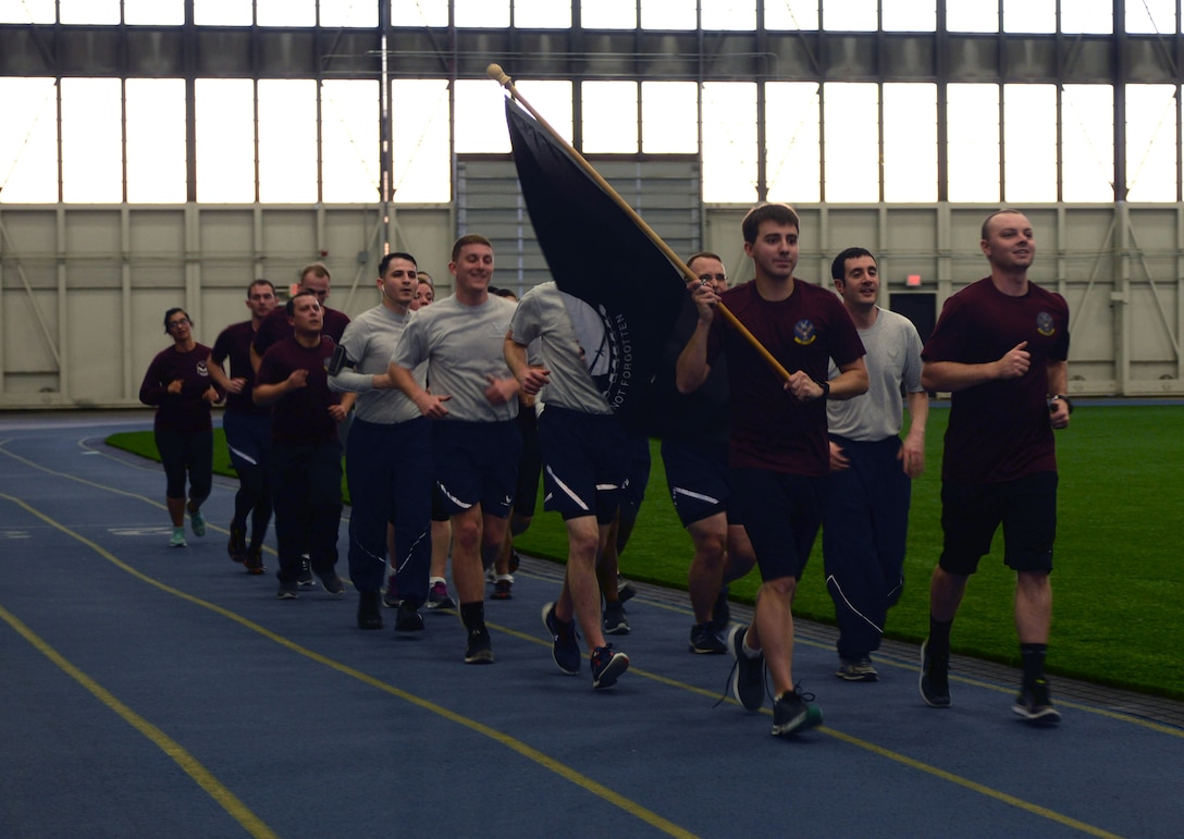 Members from the 28th Contracting and Comptroller Squadrons participate in the second annual Prisoner of War/Missing in Action 24-hour run at Ellsworth Air Force Base, S.D., Dec. 6 to 7, 2016. Participants ran in 30 minute shifts while carrying the POW/MIA flag as a way to honor and remember those who did not make it home. (U.S. Air Force photo by Airman 1st Class Denise M. Jenson)