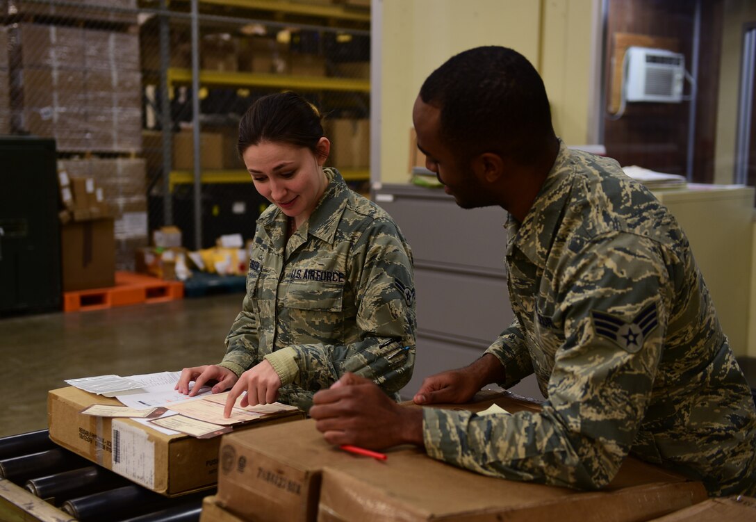 Airman 1st Class Alyssa Dreksler receives mentoring on packaging receipts from Senior Airman Jordan Fishburne, Flight Service Center technicians assigned to the a 28th Logistics Readiness Squadron, at Ellsworth Air Force Base, S.D., Dec. 6, 2016. Flight Service Center Airmen ensure all parts received are logged correctly to prevent any delays in repairs. (U.S. Air Force photo by Airman 1st Class James L. Miller)