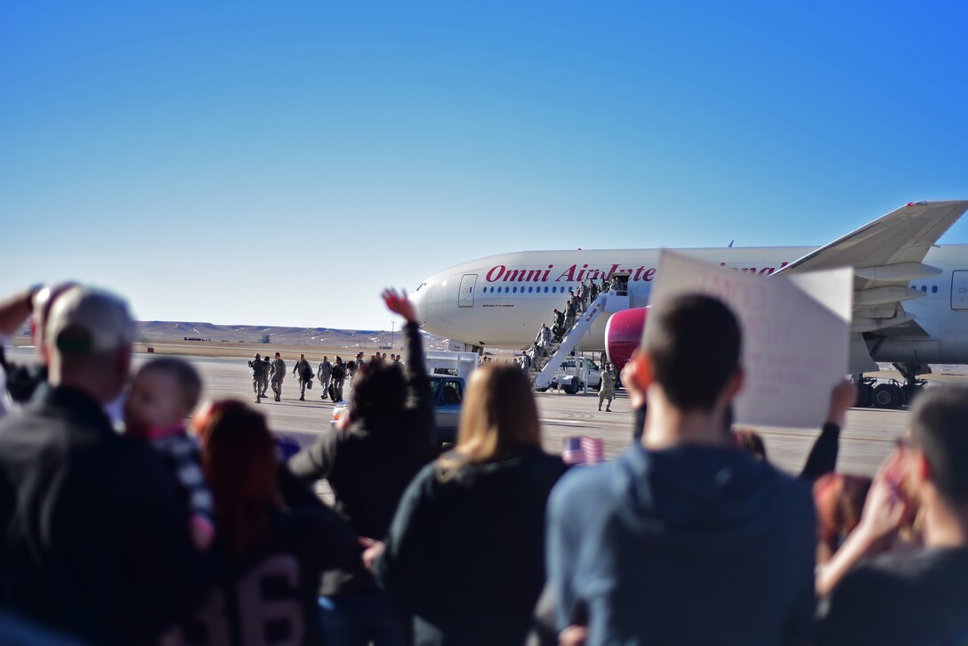 Families of the 34th Expeditionary Bomb Squadron welcome home their loved ones as they arrive at Ellsworth Air Force Base, S.D., Feb. 12, 2017, after a six-month deployment to Guam. As part of the U.S. Pacific Command’s Continuous Bomber Presence, members of the 34th EBS conducted integrated bomber training and missions in the maritime domain demonstrating the United States’ commitment to deterrence and strengthening security and stability in the Indo-Asian-Pacific region. (U.S. Air Force photo by Senior Airman James L. Miller)