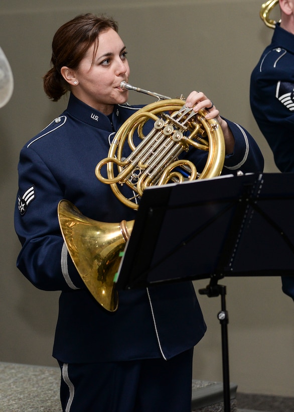 Senior Airman Alena Zidlicky, a musician assigned to Offutt Brass, the brass ensemble of the U.S. Air Force Heartland of America Band, plays her French horn during a performance at Mount Rushmore, S.D., Feb. 20, 2017. Offutt Brass will perform throughout western South Dakota, playing music from classical to jazz as well as patriotic tunes. (U.S. Air Force photo by Senior Airman Anania Tekurio)