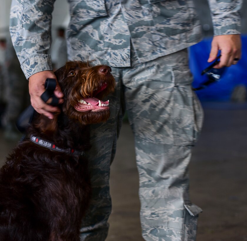 Staff Sgt. Ted Zielinski, an electronic warfare systems craftsman with the 28th Aircraft Maintenance Squadron, pets his dog, Buckley, while waiting for his luggage after returning from Red Flag 17-3, July 29, 2017. The exercise provides aircrews an opportunity to train in realistic scenarios to increase combat readiness, capability and survivability. (U.S. Air Force photo by Airman 1st Class Randahl J. Jenson)