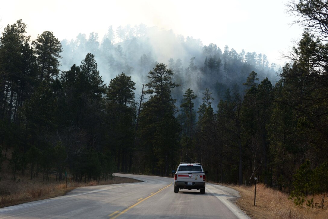 Staff Sgt. Robert Dickson, a crew chief assigned to the 28th Civil Engineer Squadron Firefighter Flight, brings tools to Ellsworth firefighters assisting with the fire in Custer State Park, S.D., Dec. 13, 2017. The park wildfire grew rapidly overnight, pushing beyond the park's borders and threatening nearby communities. (U.S. Air Force photo by Airman 1st Class Donald C. Knechtel)