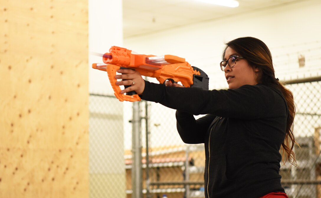 Airman 1st Class Shelsea Marble, a 28th Communications Squadron cyber systems operations technician, shoots a toy gun as part of the Sexual Assault Prevention race at Ellsworth Air Force Base, S.D., April 20, 2018. After completing a physical challenge, participants in the Sexual Assault Prevention and Response race had to answer three questions, if they failed to answer the questions they had to pay a physical penalty such as push-ups, sit-ups or squats. (U.S. Air Force photo by Airman 1st Class Thomas Karol)