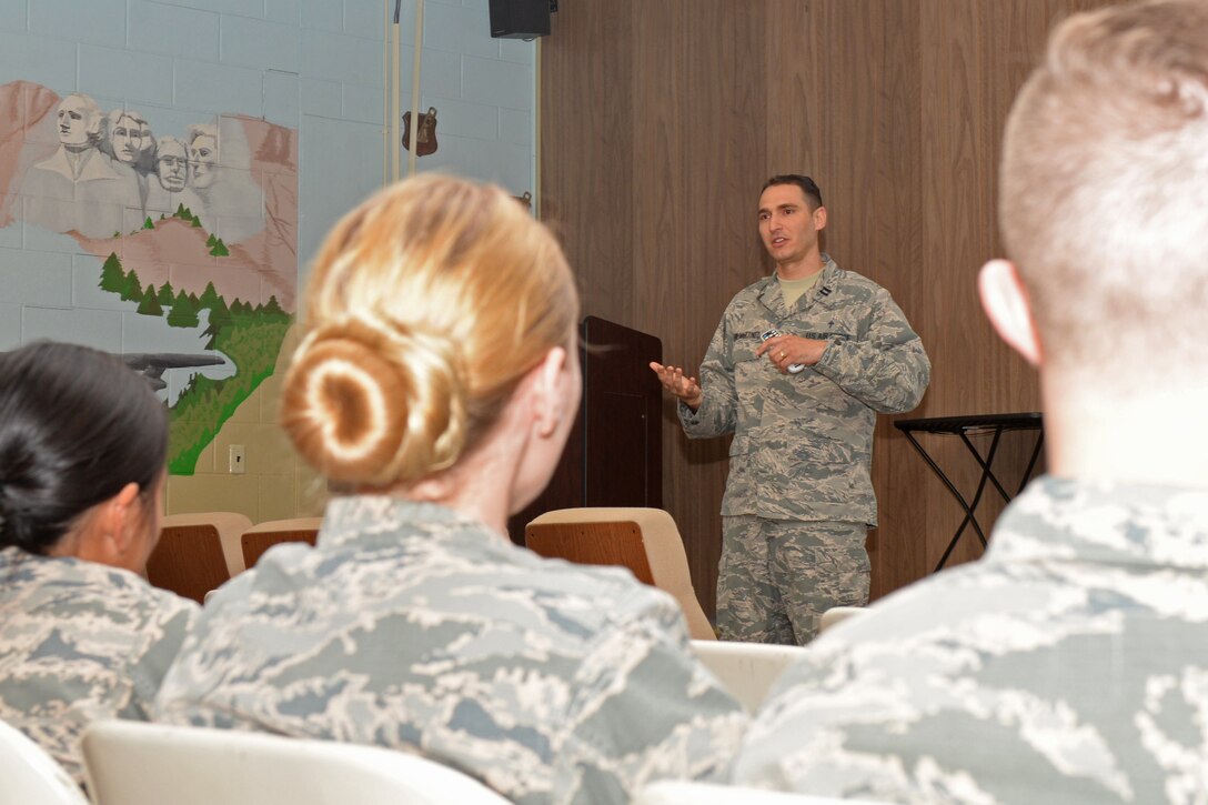 Capt. Raidel Leon-Martinez, a 28th Bomb Wing chaplain, talks to Airmen at the 28th Communications Squadron building about having boundaries and taking care of themselves at Ellsworth Air Force Base, S.D., May 9, 2018. The wing’s chapel team paired up with the mental health clinic to help Airmen express anything going on in their lives and to know the avenues they have access to. (U.S. Air Force photo by Airman 1st Class Nicolas Z. Erwin)