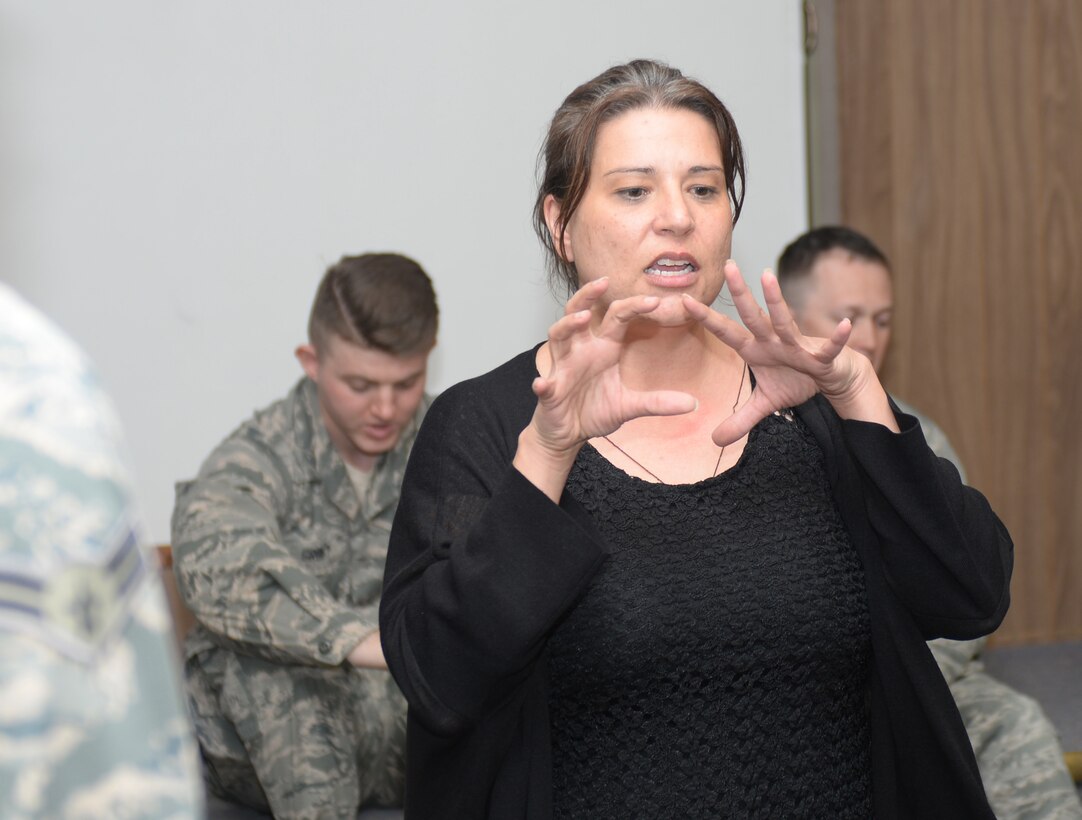 Christle Usera, a 28th Medical Operations Squadron mental health provider, explains the rules of a human performance team building exercise at Ellsworth Air Force Base, S.D., May 9, 2018. These team building exercises help teach Airmen the value of communication when going through situations out of their control. (U.S. Air Force photo by Airman 1st Class Nicolas Z. Erwin)