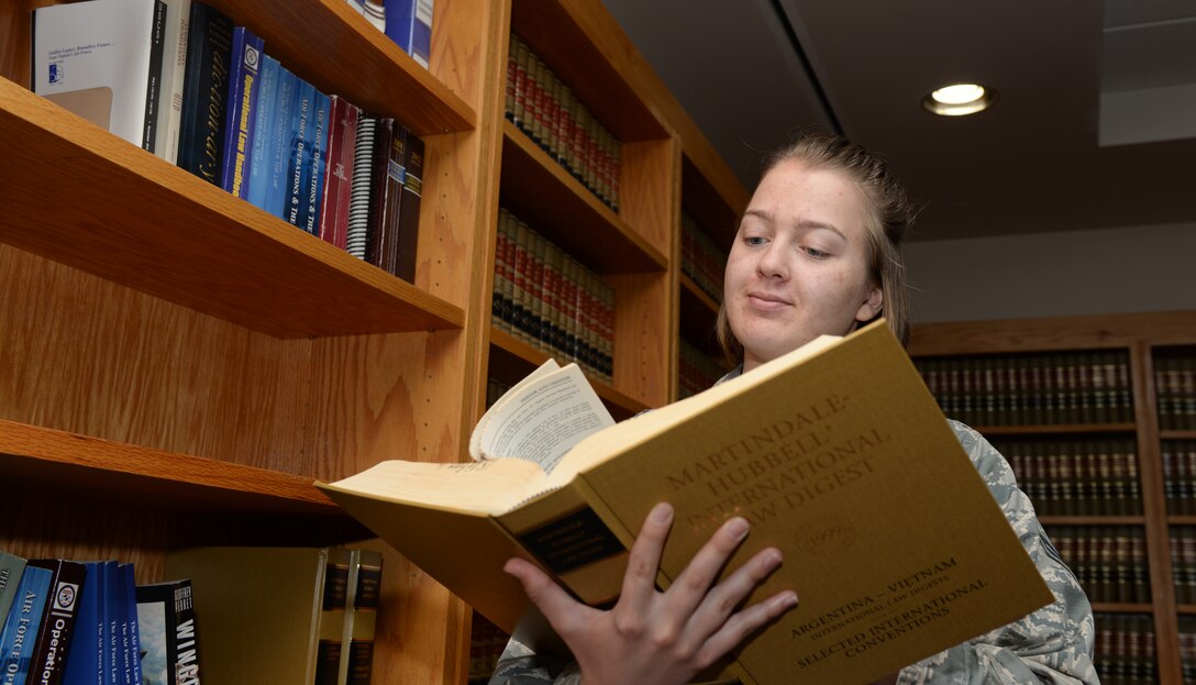 Airman 1st Class Mary Walsh, a 28th Bomb Wing general law paralegal, reads a book on prior military court cases at Ellsworth Air Force Base, S.D., July 17, 2018. Most papers and documents pertaining to legal trials are found online for legal personnel, and the 28th Bomb Wing legal office has a library with over 300 volumes of different court proceedings. (U.S. Air Force photo by Airman 1st Class Nicolas Z. Erwin)