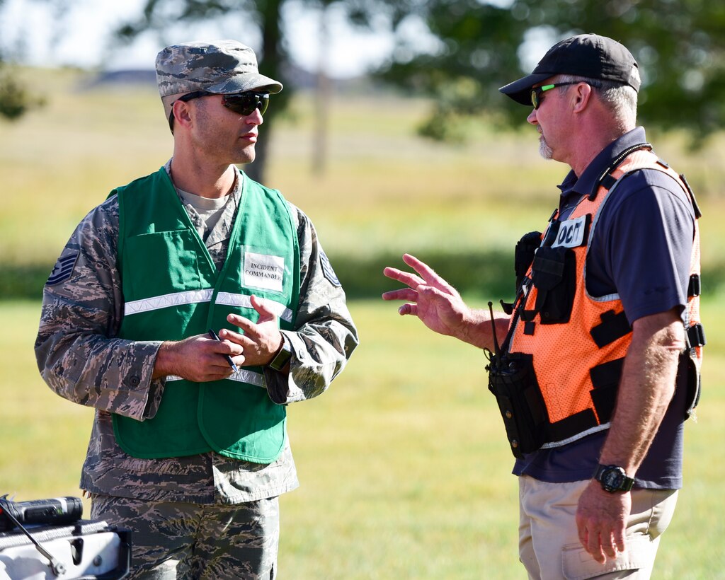 Airmen from the 28th Bomb Wing and members of the Army North Civil Support Team work together during an emergency response exercise at Ellsworth Air Force Base, S.D., Aug. 30, 2018. Ellsworth Airmen trained with soldiers from the South Dakota National Guard, practicing emergency response procedures in multiple explosive, chemical and radiological environments. (U.S. Air Force photo by Senior Airman Randahl J. Jenson)