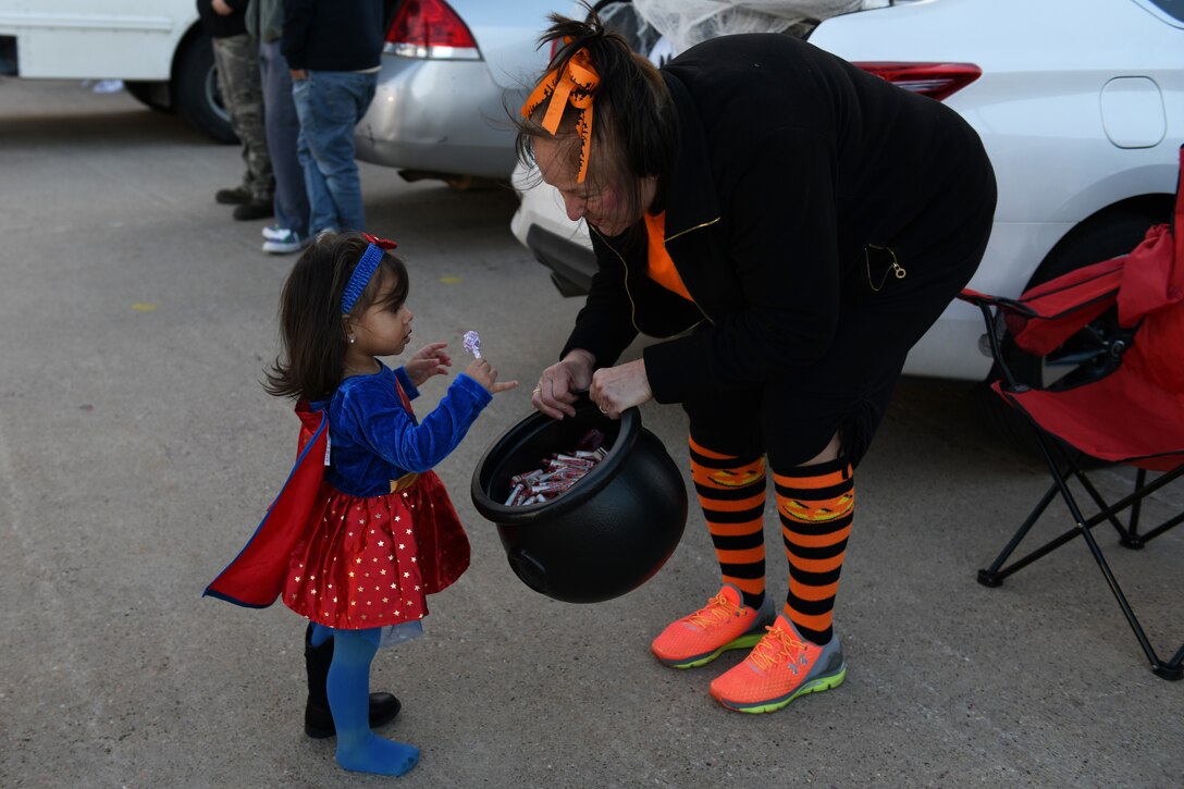 Sabrina Rodriguez, the daughter of Senior Airman Manuel Rodriguez-Sepulveda, a 28th Aircraft Maintenance Squadron hydraulics technician, collects candy from Angela Gadomski, a retired youth center sports director, at the Pride Hangar parking lot on Ellsworth Air Force Base, S.D., Oct. 26, 2018. The Trunk or Treat event promotes morale for service members and their families. (U.S. Air Force photo by Airman 1st Class Christina Bennett)