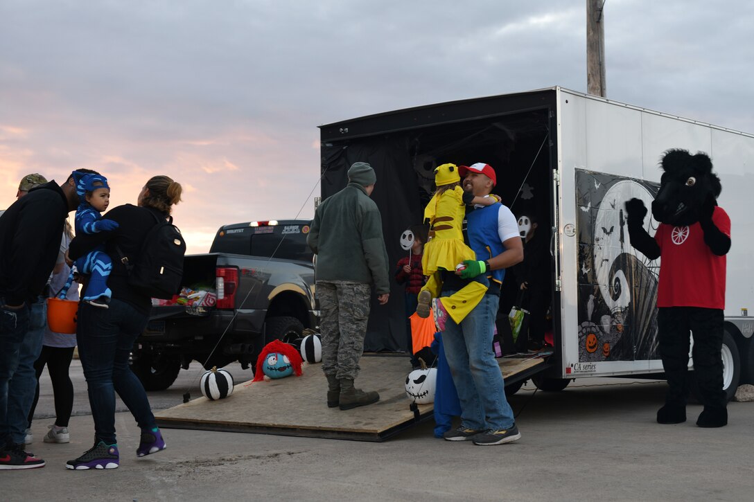 Children and their families wait in line before entering a “Nightmare Before Christmas” themed trailer provided by the 28th Logistics Readiness Squadron at Ellsworth Air Force Base, S.D., Oct. 26, 2018. Volunteers from the 28th Bomb Wing decorated their personal and work vehicles with Halloween themes and put them on display. (U.S. Air Force photo by Airman 1st Class Christina Bennett)