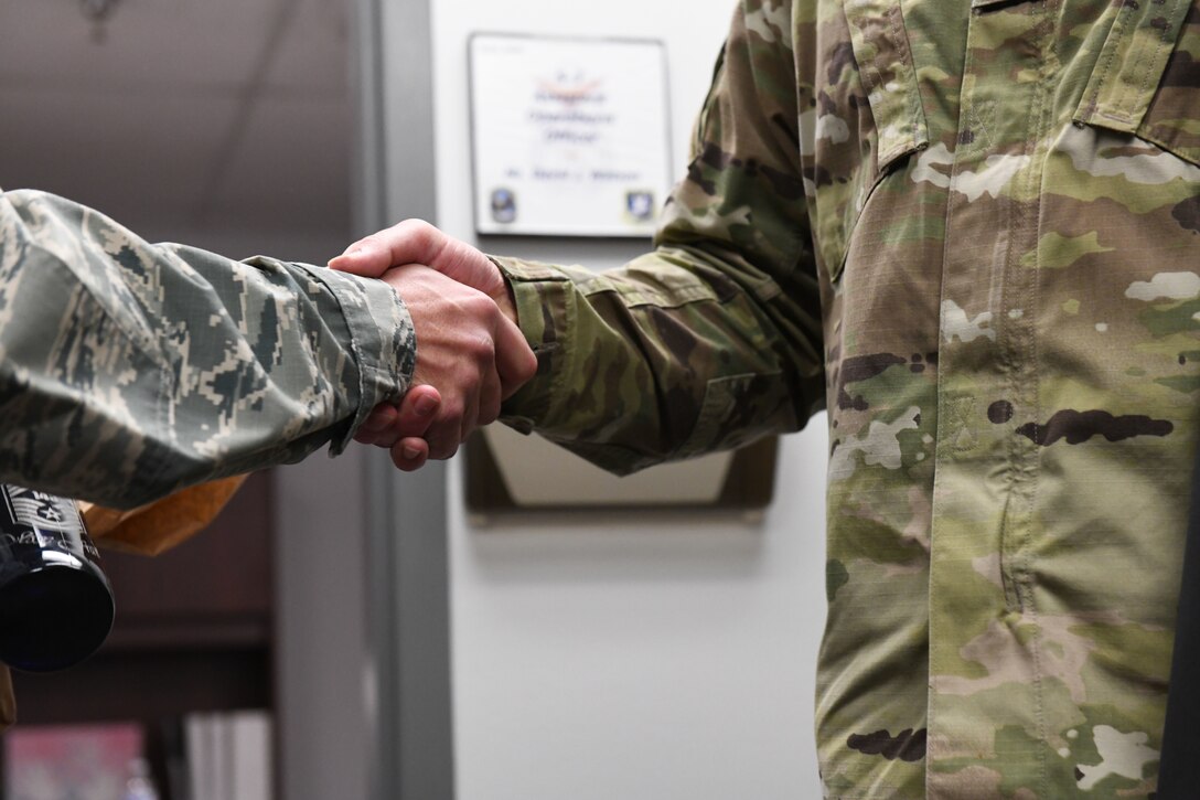 Senior Master Sgt. Jesse Frank, the 28th Security Forces Squadron operations superintendent, shakes hands with Chief Master Sgt. Justin Walker, the 28th Bomb Wing interim command chief at Ellsworth Air Force Base, S.D., Dec. 4, 2018. Frank was informed that he’d been selected for the highest enlisted rank: chief master sergeant. (U.S. Air Force photo by Airman 1st Class Thomas Karol)