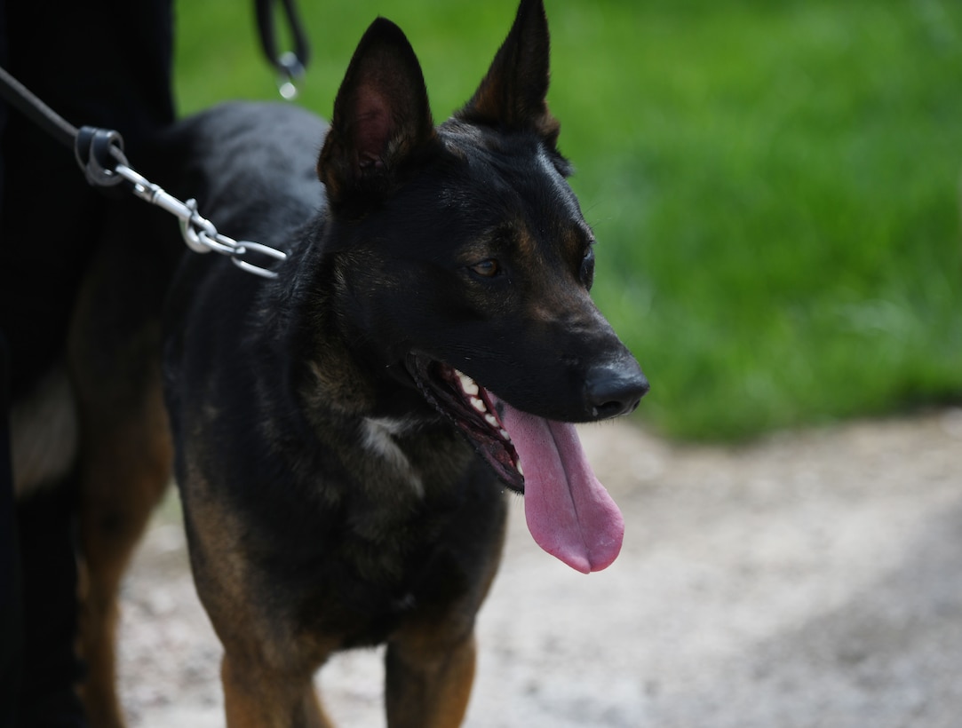 Sem, a South Dakota Highway Patrol police K-9, waits to compete in the 28th Security Forces Squadron military working dog competition held in honor of National Police Week at the K-9 obedience course on Ellsworth Air Force Base, S.D., May 16, 2019. National Police week is held in observance of law enforcement officers who have died in the line of duty while protecting communities nationwide. (U.S. Air Force photo by Airman 1st Class Christina Bennett)