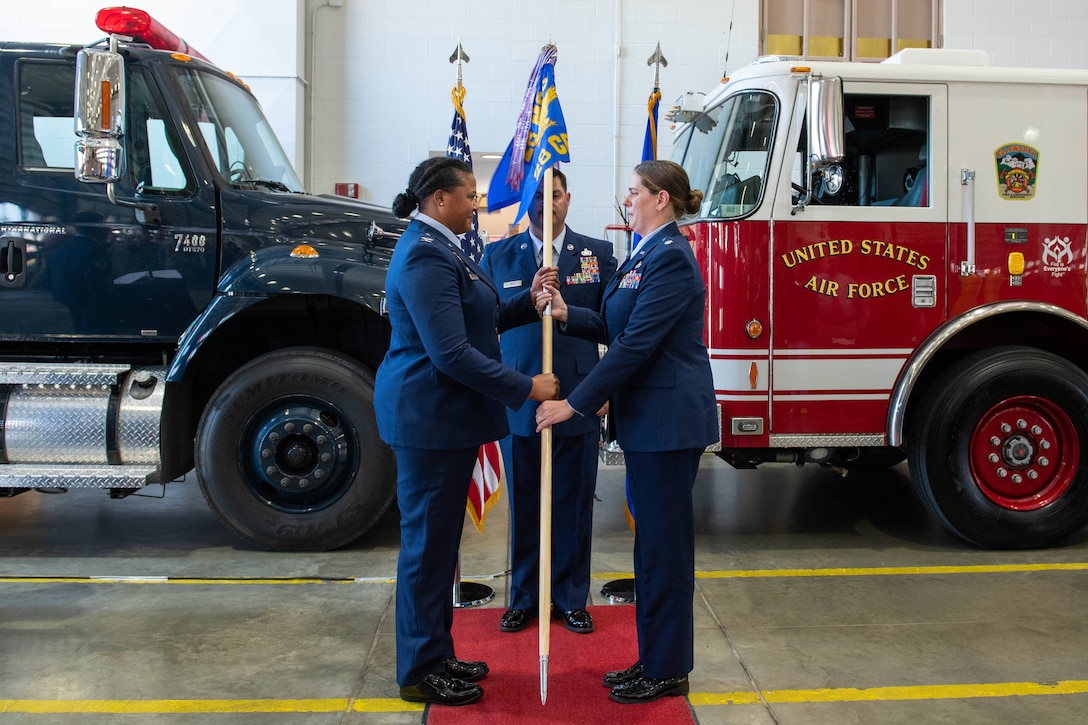 U.S. Air Force Lt. Col. Melissa D. Jumper, the incoming 28th Civil Engineer Squadron commander, receives the 28th Civil Engineer Squadron’s guidon from U.S. Air Force Col. Patrice O. Holmes, 28th Mission Support Group commander during an assumption of command at Ellsworth Air Force Base, S.D., July 29, 2022. Presenting the unit guidon is a symbolic gesture of handing the command of a unit to a gaining officer. (U.S. Air Force photo by Senior Airman Quentin Marx)