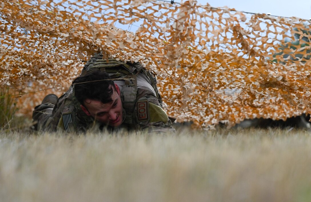 Staff Sgt. Dillon Willis, 28th Civil Engineer Squadron explosive ordnance disposal technician, performs a low crawl during the Prime Base Engineer Emergency Force Challenge at Ellsworth Air Force Base, S.D., Sept. 22, 2022. The Prime BEEF Challenge was designed to test the overall readiness of Combat Engineers. A combat engineers mission is to enter any space within an area of responsibility and recover an airfield, re-establish infrastructure, and establish air power wherever they are assigned. (U.S. Air Force photo by Airman Yendi Borjas)